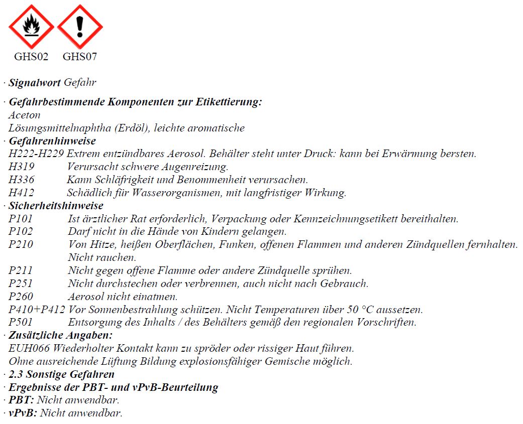 Zusätzliche Angaben: EUH066 Wiederholter Kontakt kann zu spröder oder rissiger Haut führen.